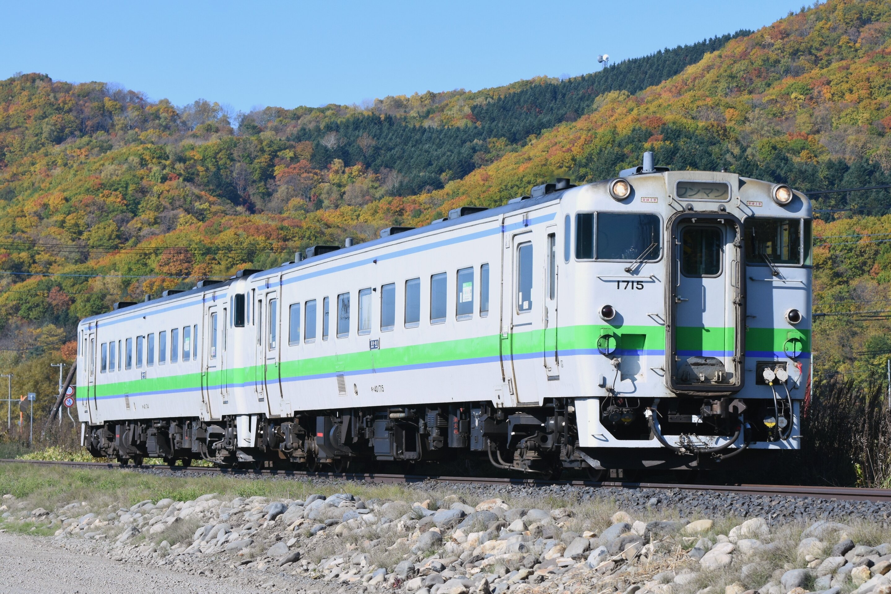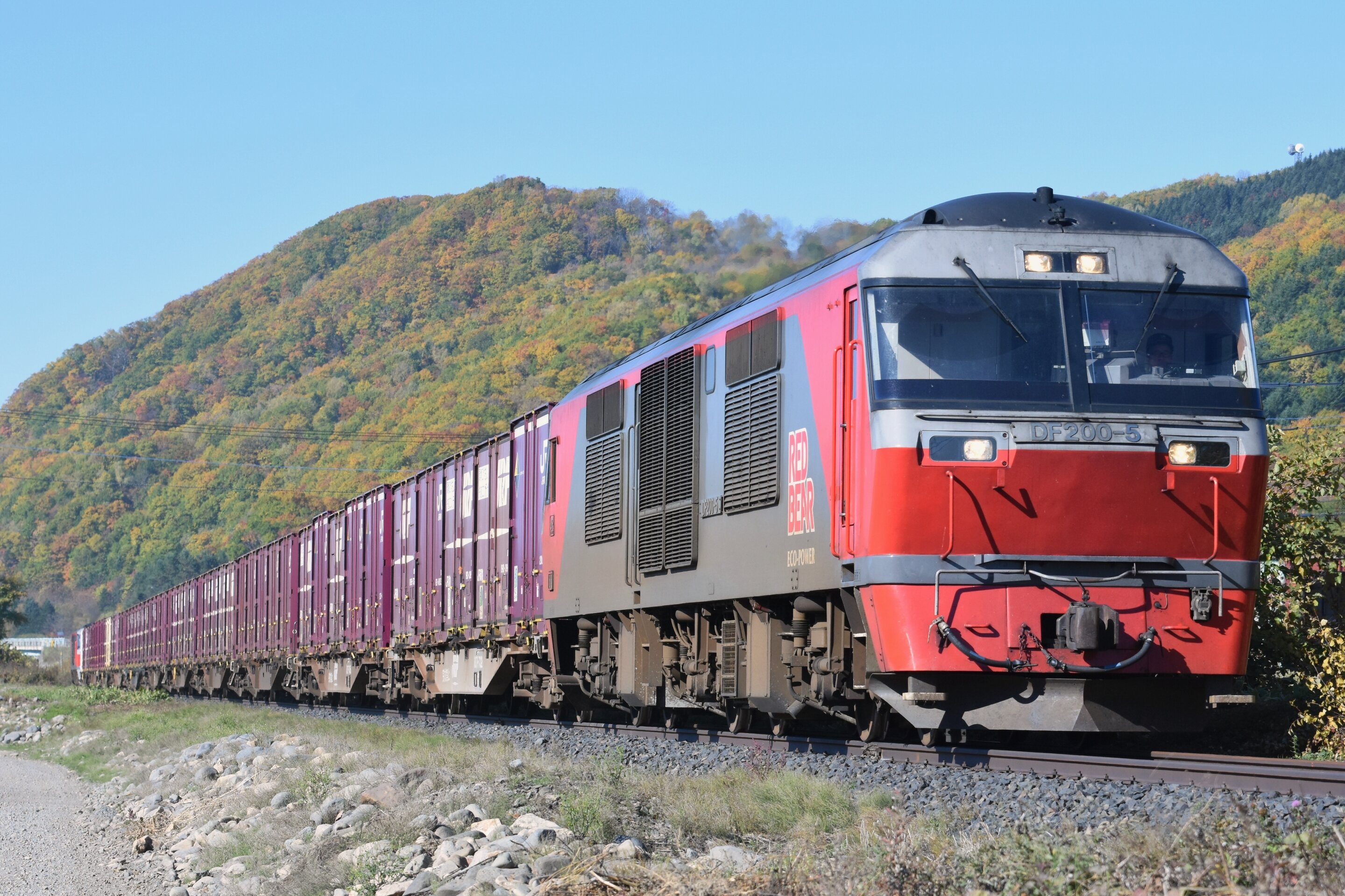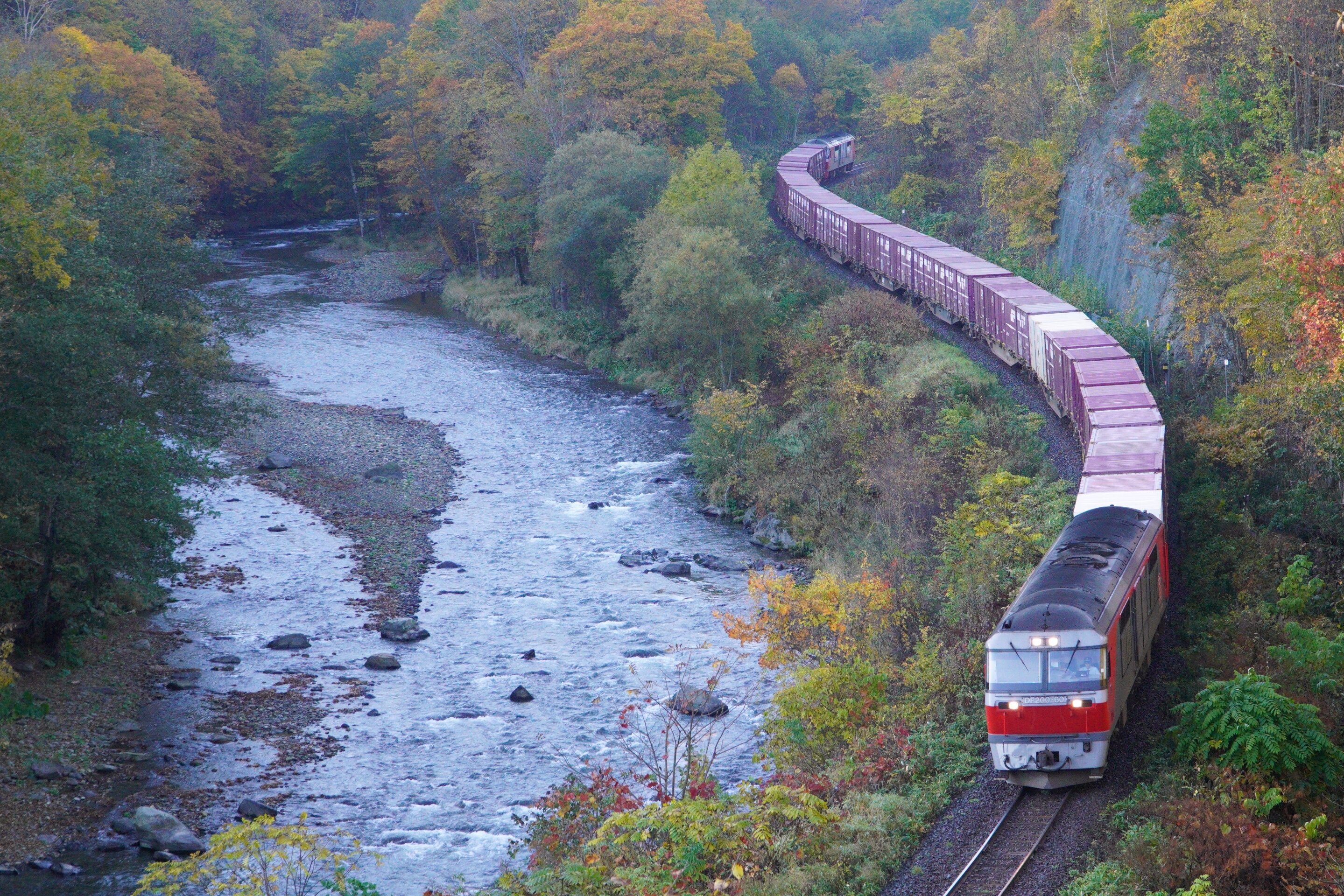 2020年10月18日 2020/10/18 石北臨貨 石北本線には季節限定で貨物列車が走ります。DF200がプッシュプルで峠を越える姿は迫力満点でした。白滝発祥の地からの俯瞰。ここは晴れていても山影が落ちてしまう撮影地。ロケーションは良いのですがイマイチ感が拭えません。本命はコチラ。大型ディーゼル機関車が牽引する貨物列車はとてもカッコ良かったです。箱型DLを撮ると海外に行ったような気分になりますね。中国に似た機関車いますしおすし…貨物の前走りで来たヨンマル重連。石北線にも新型気動車が導入されるとのことで、まもなく見納めになりますね。以上。